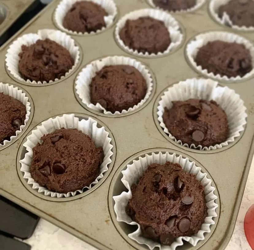 - Fold in your chocolate-chips, then using a muffin scoop, evenly disperse the batter between the 15 muffin cups.