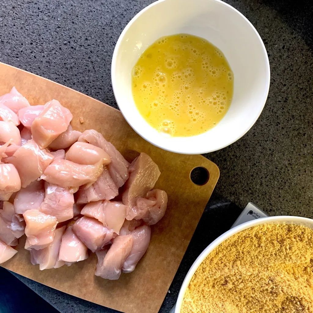 - Cut your chicken breasts into small nugget size pieces.