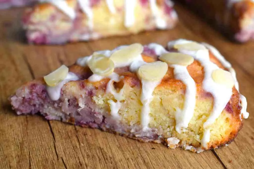 These scones turned out amazing. A soft pillowy almond dough is studded with tangy raspberry pieces then topped with a delicious almond glaze and almond slivers.