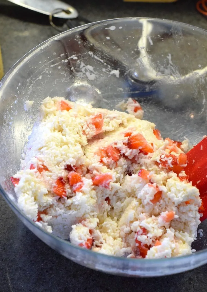 - Next, add your chopped strawberries and again mix gently until combined.