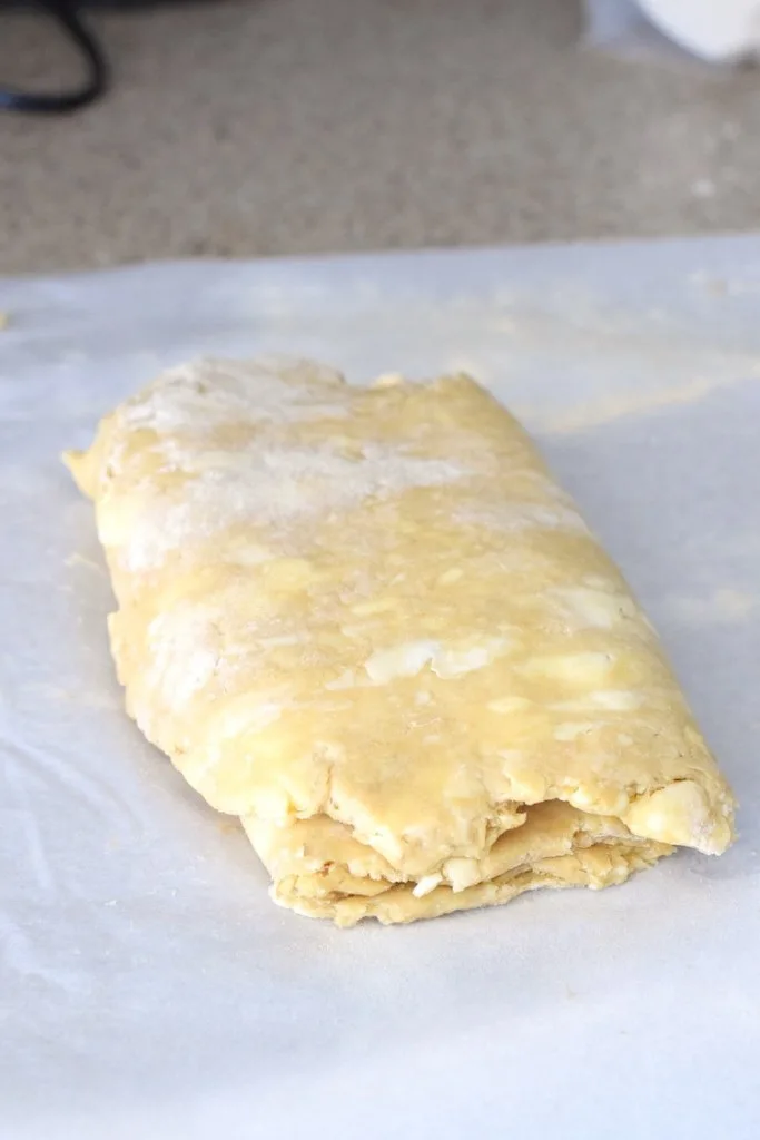 - Roll the dough out length-wise to get a long rectangle. Fold one side of the dough inwards, then the other like folding a brochure or letter. Gently push any rough edges in to straighten out the shape of your dough. Then turn it 90*. flour the surface and top of the dough again and repeat the first step of rolling it out into a long rectangle..then again fold it like a letter. Repeat this process 4-5 times in total. Your dough may get tough to roll out. If this happens, simply refrigerate and cover the dough for another 30min – 1 hour to allow the gluten time to relax.